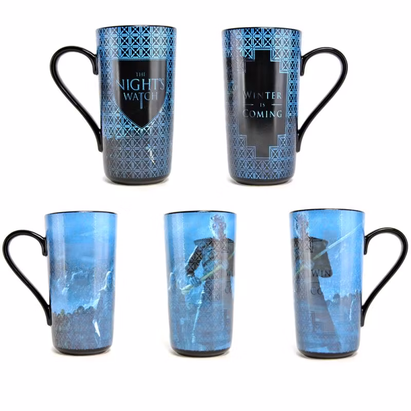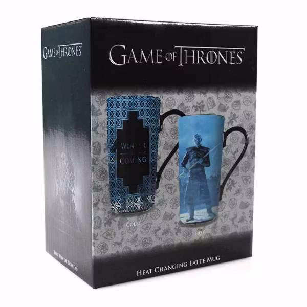 Denna Game of Thrones värmekänsliga lattemugg gör oss påminda om en av de mest förödande striderna i seriens historia, massakern på Hardhome, där the Night´s watch och de fria människornas kamp mot white ealkers. Kall, visar muggen Stark husets ord "winter is coming" på framsidan, som är en varning inte bara mot den kalla årstiden utan även mot de vita vandrarna. Baksidan visar the Night watch sköld. När du häller i varm vätska omvandlas muggen till att visa Night King, ledaren för White walkers, och hur han ser när de återstående av Night´s watch evakuerar med båt omgiven av tusentals dödade som återuppstår till levande döda. När du druckit färdigt återgår muggen till sitt ursprungliga tillstånd medans den kyls av. Känner du någon som gillar Game of Thrones samt kaffe med mycket mjölk så är detta den perfekta presenten.